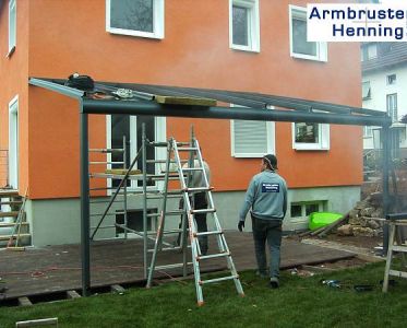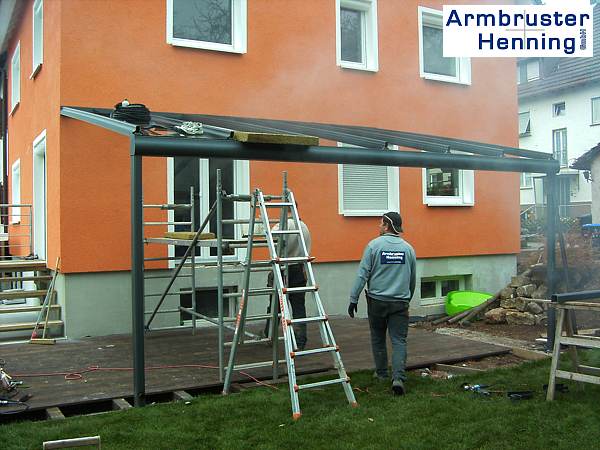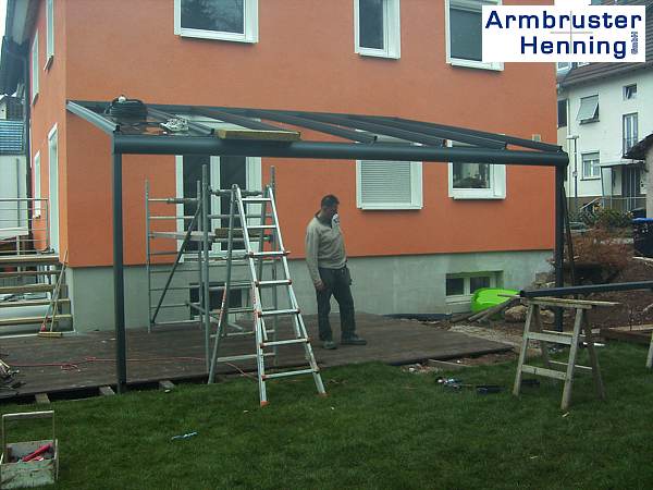 Hier sehen Sie wie das Terrassendach in Heidelberg aufgebaut wurde. Zuerst wurde die Isolierung an den Befestigungspunkten für die Firstschiene vorgebohrt um die Klebeanker von Hilti zu setzen. Dann wurde die Konstruktion der Überdachung gestellt, ausgerichten und Festgemacht. Die Dachgläser wurden gelegt und mit den Glasleisten befestigt.
