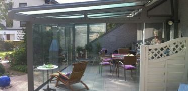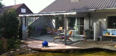 Eine komplett verglaste Überdachung, mit Leichtlaufschiebetüren (Rahmenlos). Die Besonderheiten sind für Sie leicht zu erkennen!