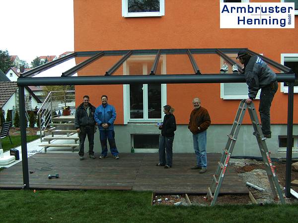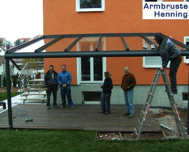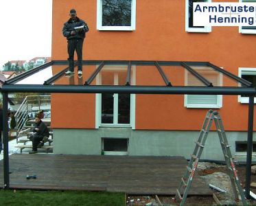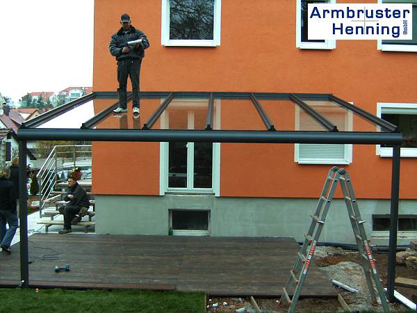 Hier sehen Sie wie das Terrassendach in Heidelberg aufgebaut wurde. Zuerst wurde die Isolierung an den Befestigungspunkten für die Firstschiene vorgebohrt um die Klebeanker von Hilti zu setzen. Dann wurde die Konstruktion der Überdachung gestellt, ausgerichten und Festgemacht. Die Dachgläser wurden gelegt und mit den Glasleisten befestigt.